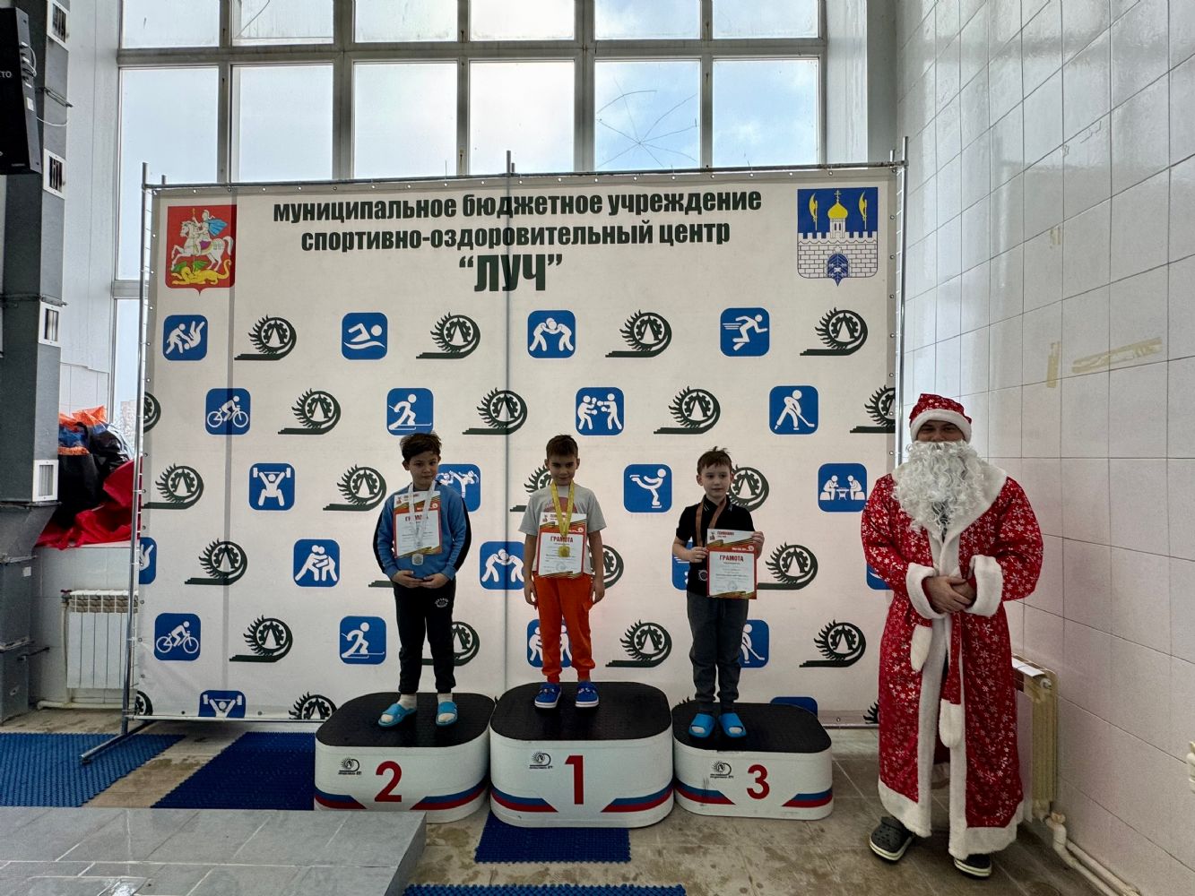 На соревнования заглянул спортивный Дед Мороз, Снегурочка и даже Белый Медведь. Поздравили всех с наступающими праздниками и вручили юным спортсменам подарки.